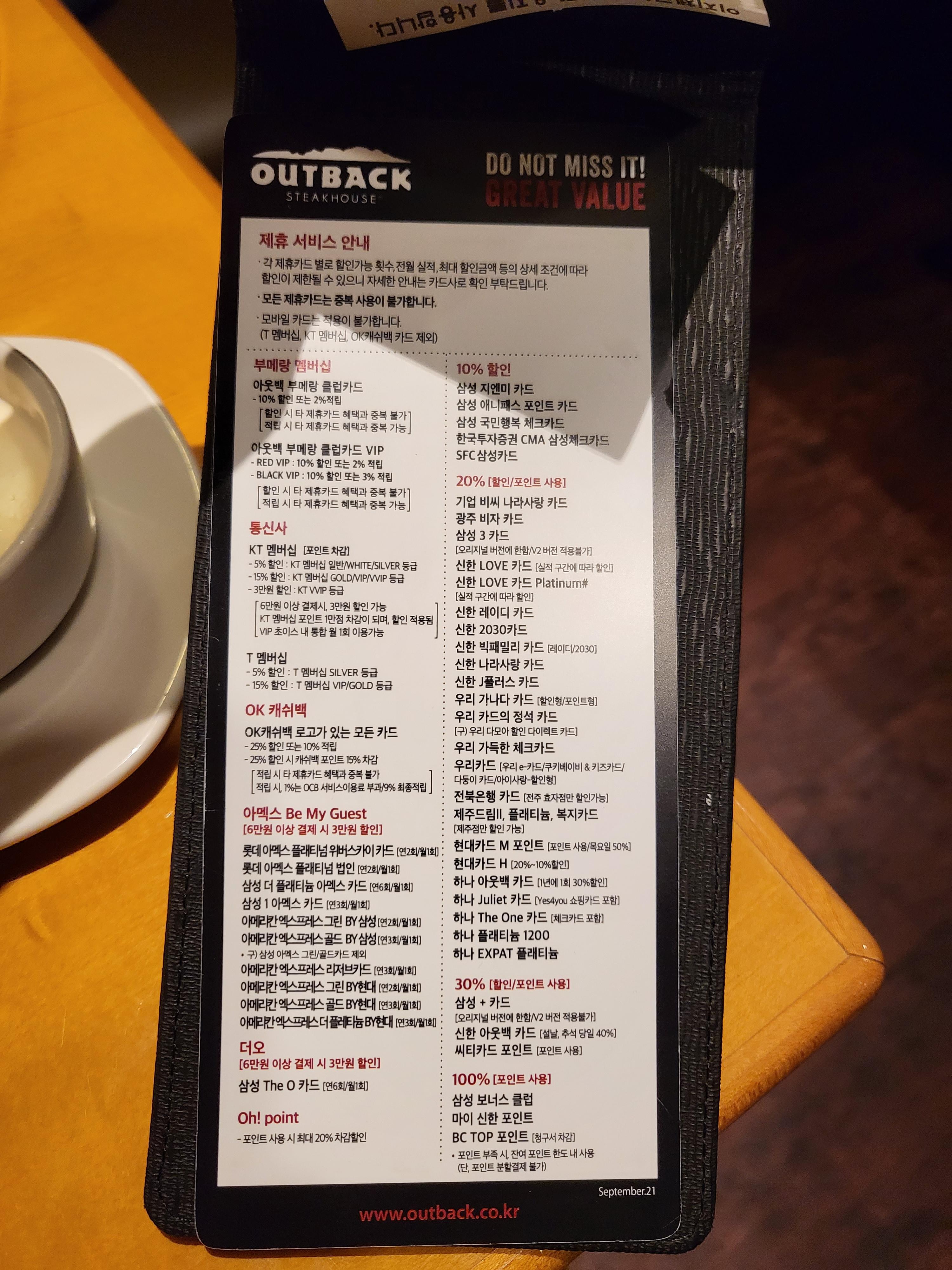 vvip 등급의 경우 한달에 한번 아웃백을 무려 30프로나 할인해준다.
