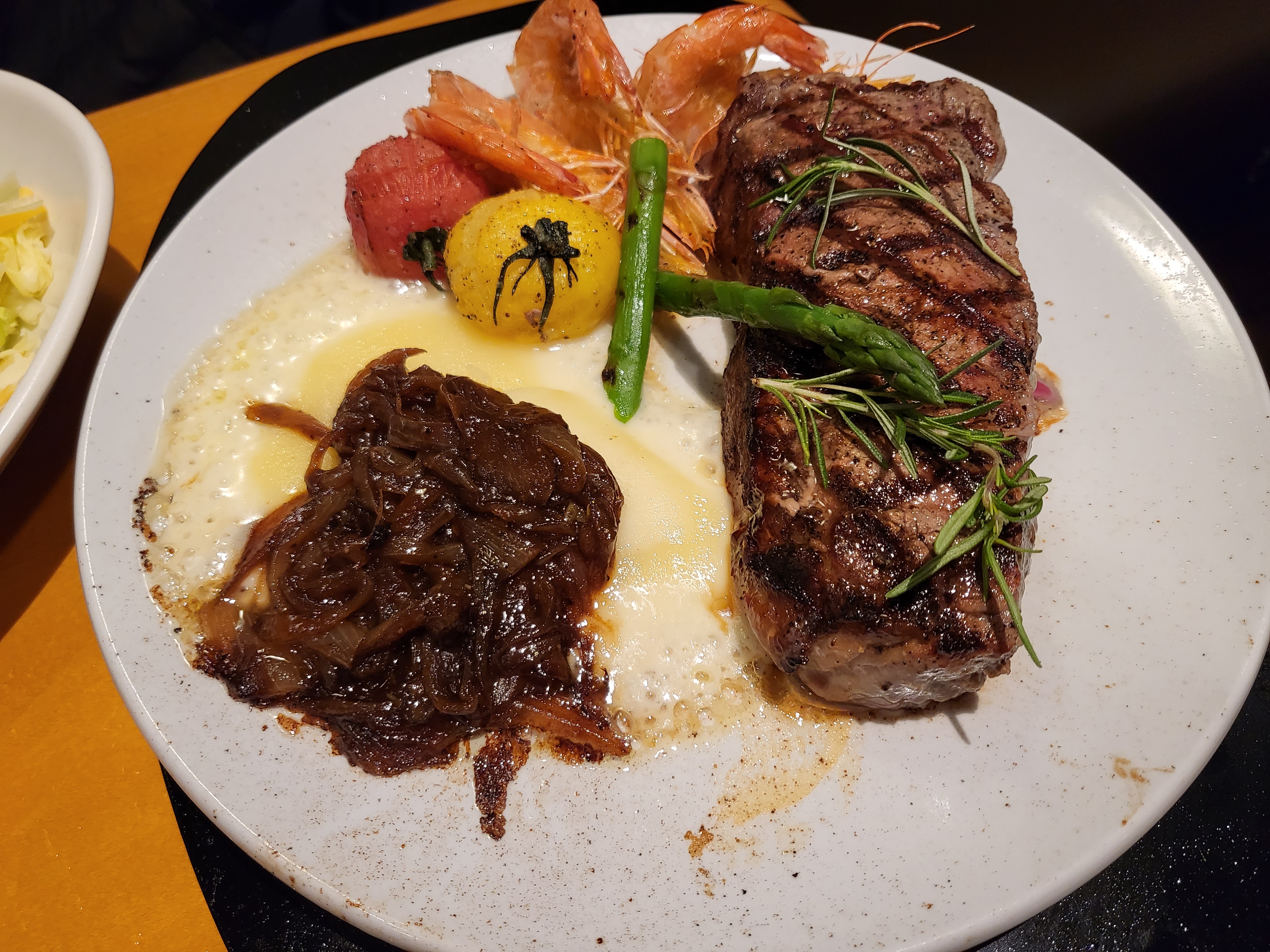 여하튼 양념을 입혀서 볶은 것 같다. 이 스테이크메뉴는 사이드가 정해져 있어서 감자를 못 먹는게 아쉽지만 저 새우가 머리까지 고소해서 그럭저럭 괜찮다.