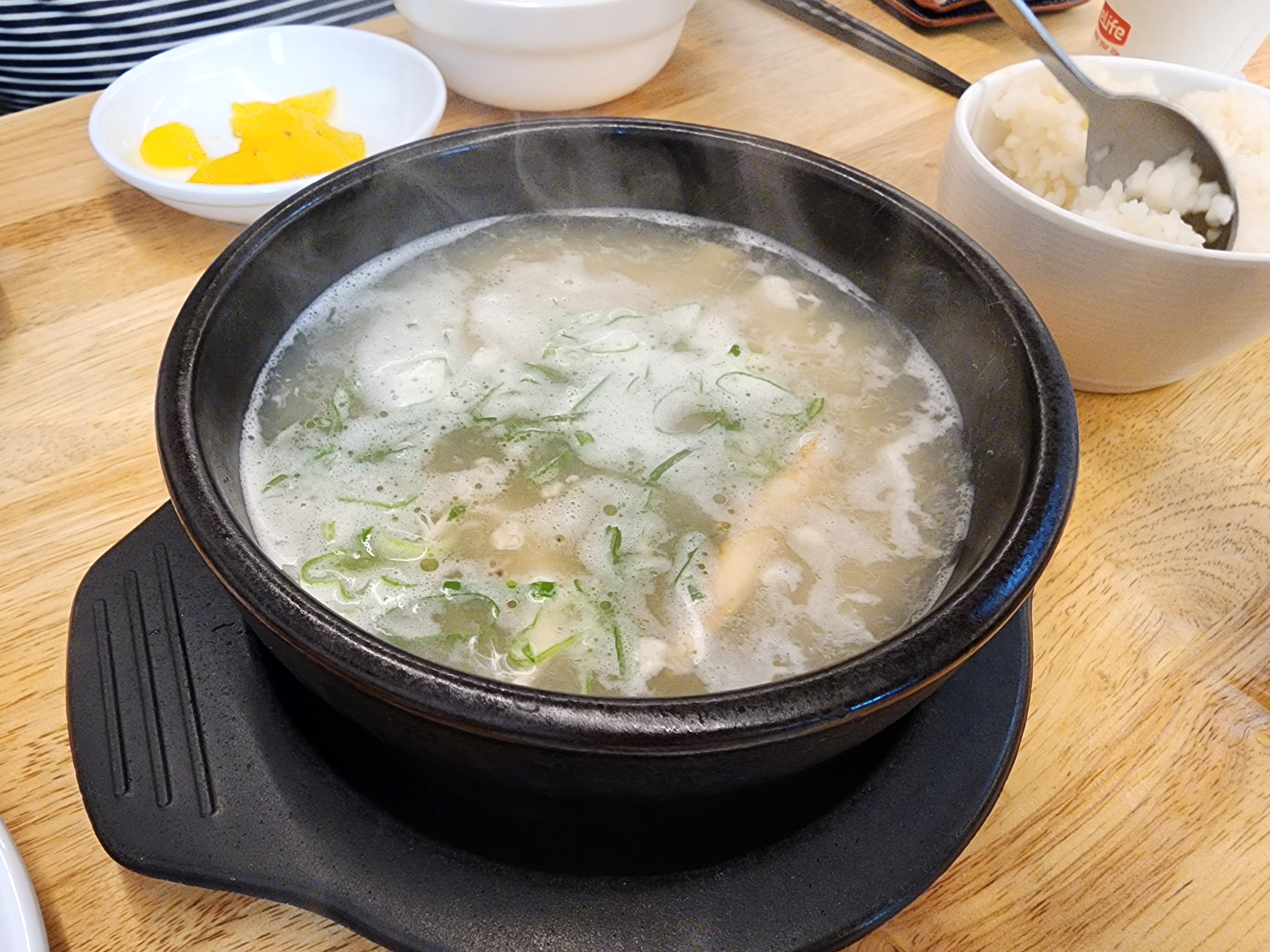 쨔란! 국물이 엄청 진했던 닭곰탕. 술 안먹어도 으어소리 절로 나오는 맛이더라. 국밥파 따님이 아주 코를 박고 먹더라. 물만 더 타서 먹임. (칼칼한게 있으면 빼달라고 했는지가 확실치 않네;)