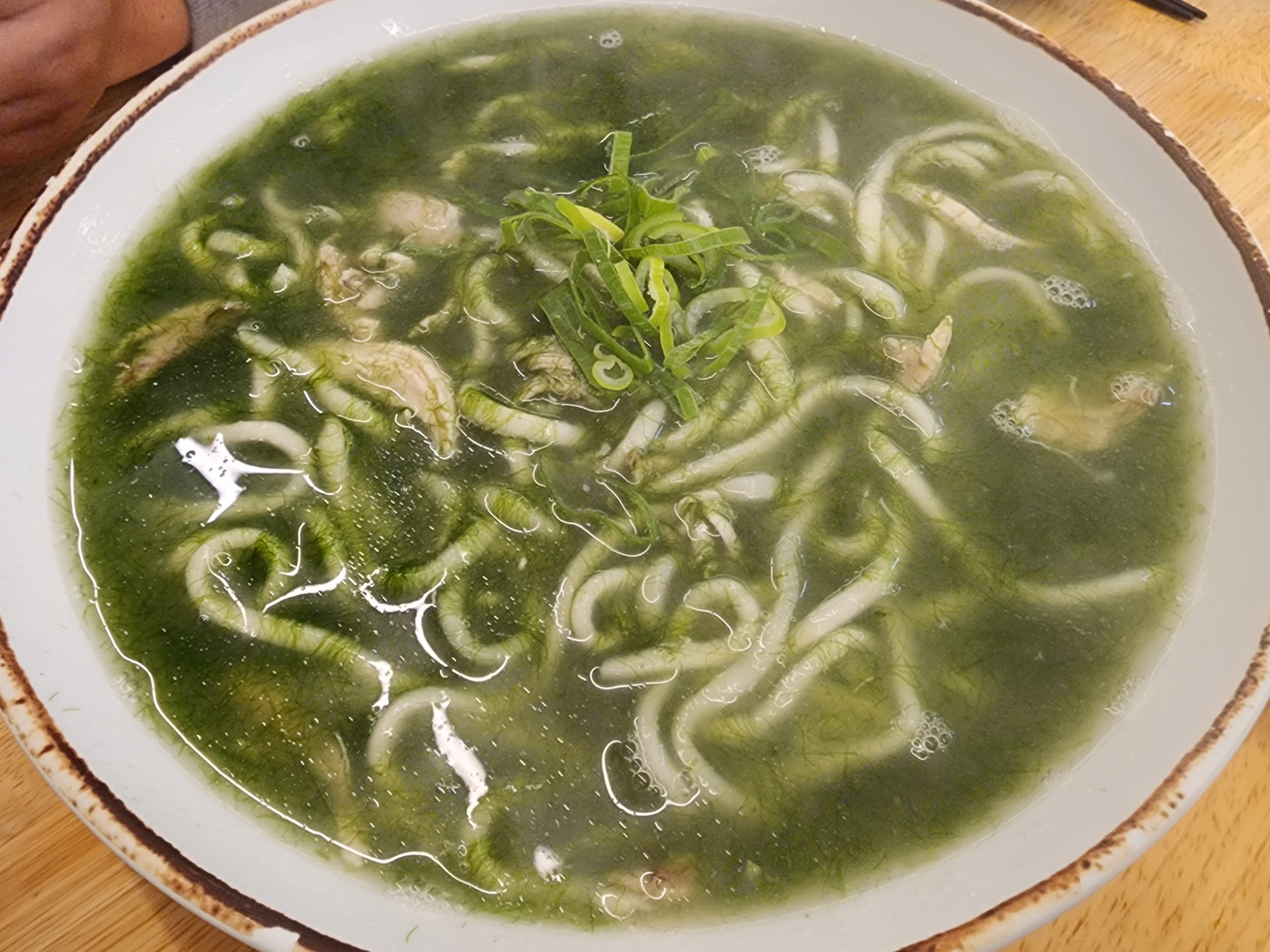 다음으로 나온 매생이 칼국수. 이 집에서 매생이 좋아하는 건 나밖에 없어서 (특이사항: 호불호 갈리는 거의 대다수의 음식이 호임) 그냥 일반 닭칼국수 시키려고 했다. 그런데 어차피 집에가면 또 애들때문에 먹고 싶은 메뉴 못고르는거 여행에서나 좋아하는 거 먹으라고 해주는 극T의 애정인지 팩폭인지에 설득되어서 매생이 골랐음.