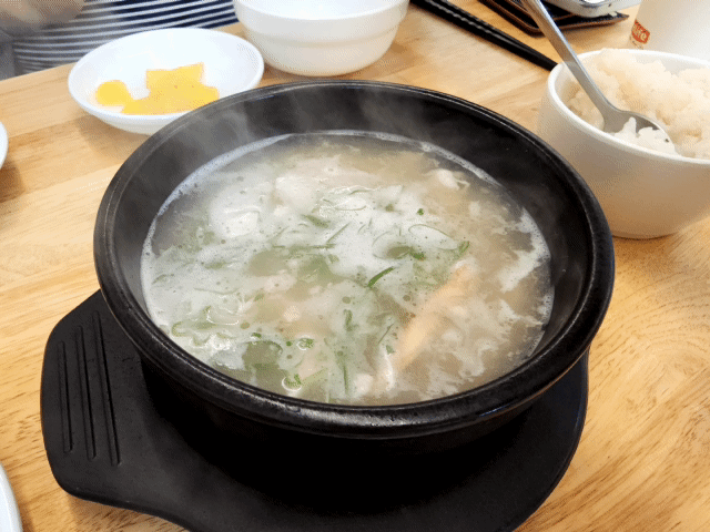 메뉴는 세 가지 시켰음. 매생이칼국수, 얼큰칼국수, 그리고 아이들 먹일 닭곰탕. 메밀전까지 처음부터 시키려고 했으나 사장님이 양이 많으니 그냥 드셔도 충분할거라고 하길래 일단 꼬리 내리고 이만큼만 시킴. 우리애들 1인분씩은 먹을거라고 말할 수는 없었다.