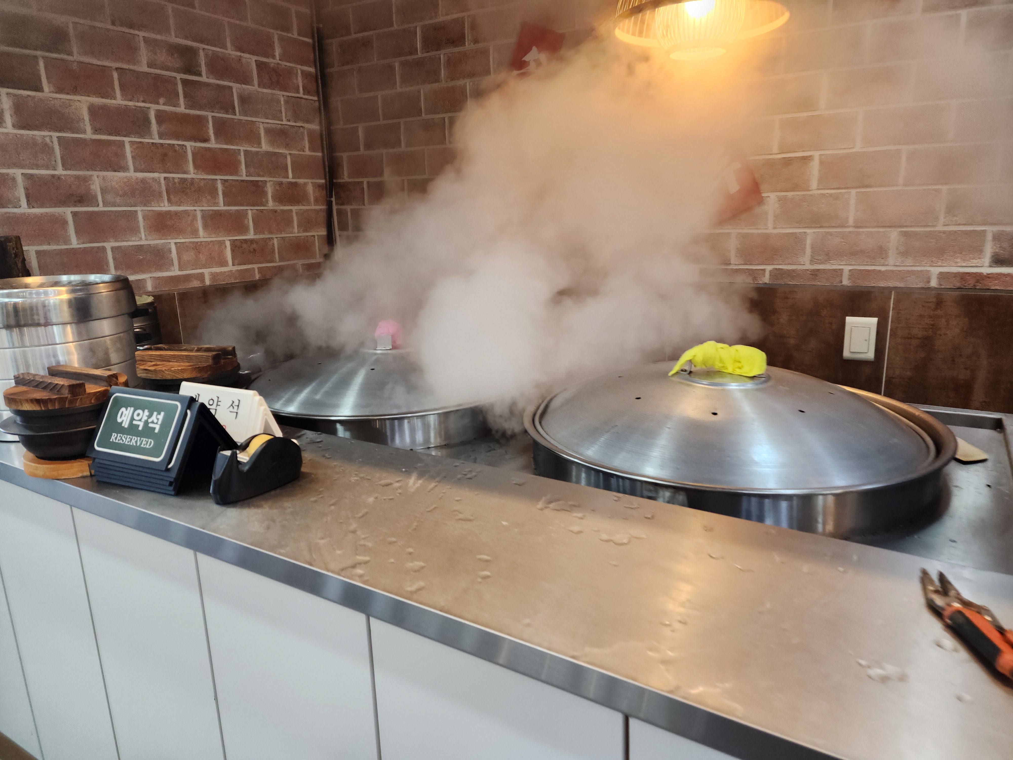 식사를 거의 마칠무렵 어디서 김이 펄펄 나길래 뭔가 싶었더니 만두에서 실시간 김이 나오는 중이었음.