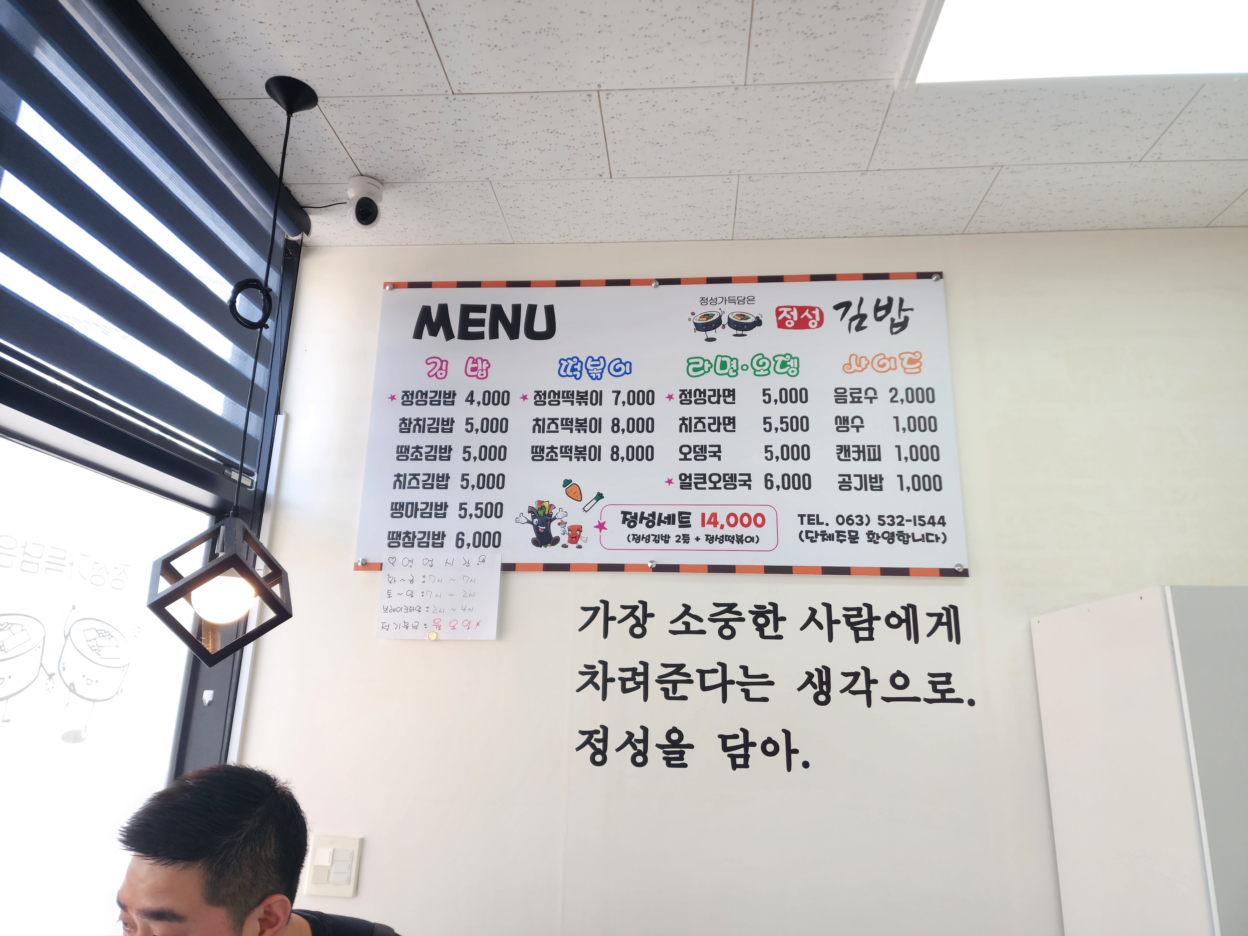 메뉴판. 가격은 그냥 무난하다. 물가가 많이 오르긴 했지만 기본김밥이 4천원이면 그렇게 저렴한 편은 아님.